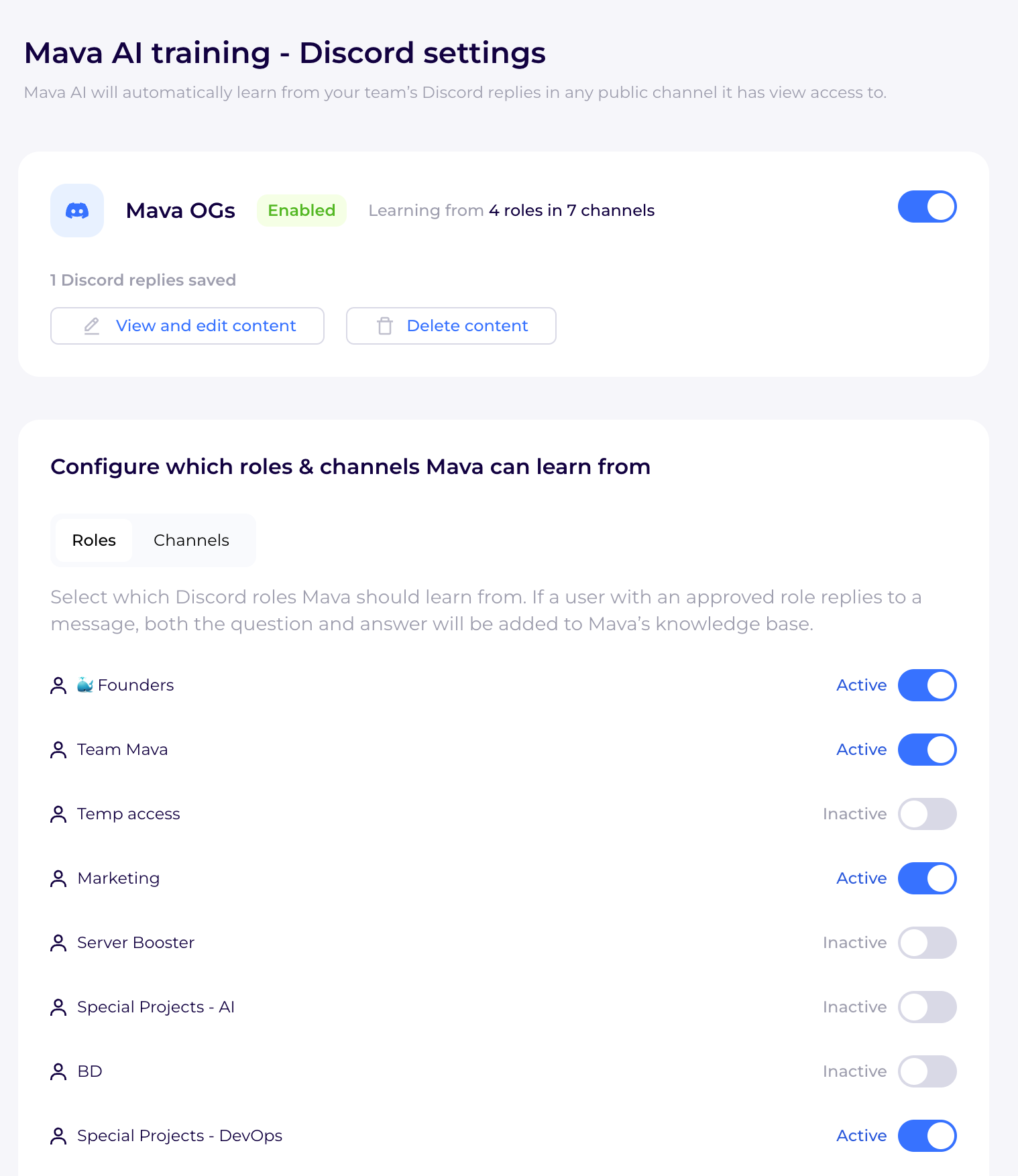 Once you've activated the feature you'll be able to select which Discord roles Mava AI can learn from. We will also show you which channels the bot currently has access to.&#x20;