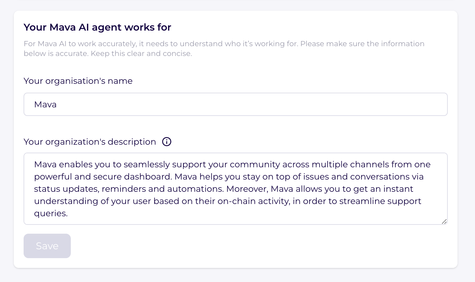 Before you test or use Mava AI it's important to head over to [Settings within the AI section](https://dashboard.mava.app/dashboard/admin/ai/settings) and input your company name as it's shown in your documents as well as a detailed description of your company.&#x20;
