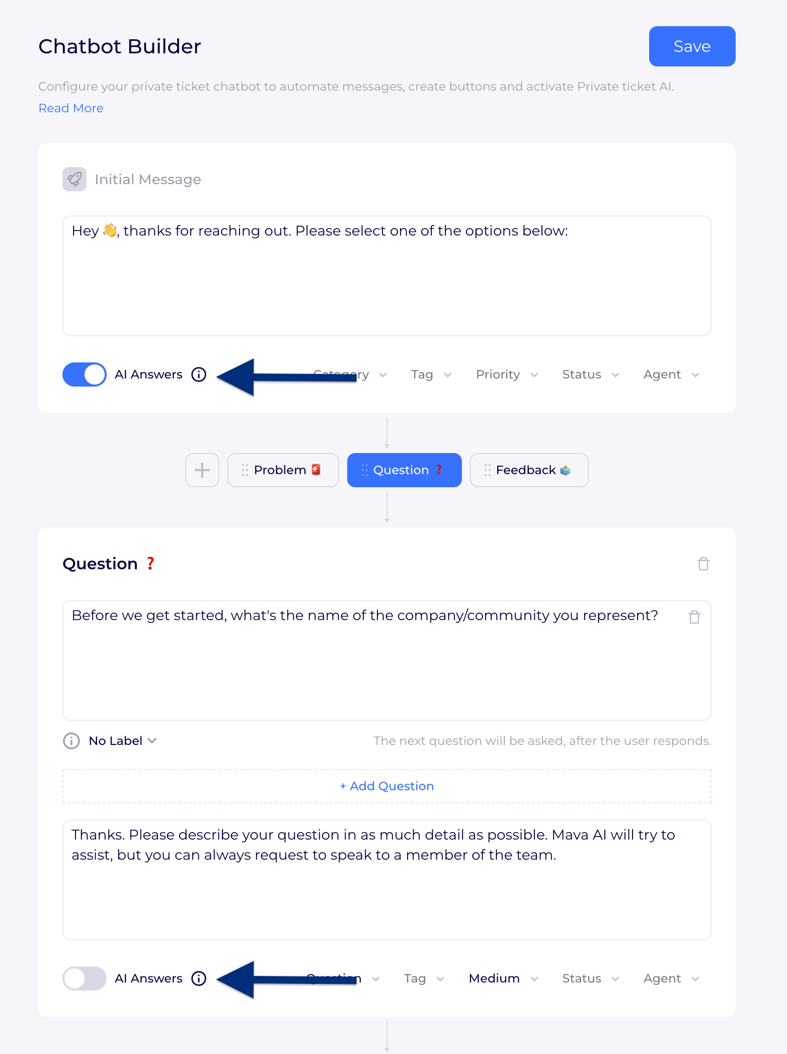 Once you've configured the chatbot builder press the Save button on the top right.