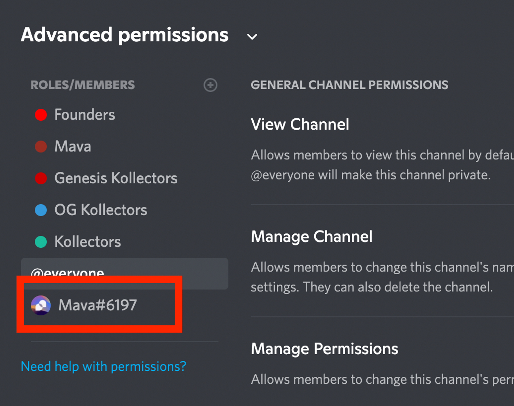Find the Mava bot from in the ‘Roles/Members’ section and click on it. If you don’t see the Mava role, you will need to search for it manually.