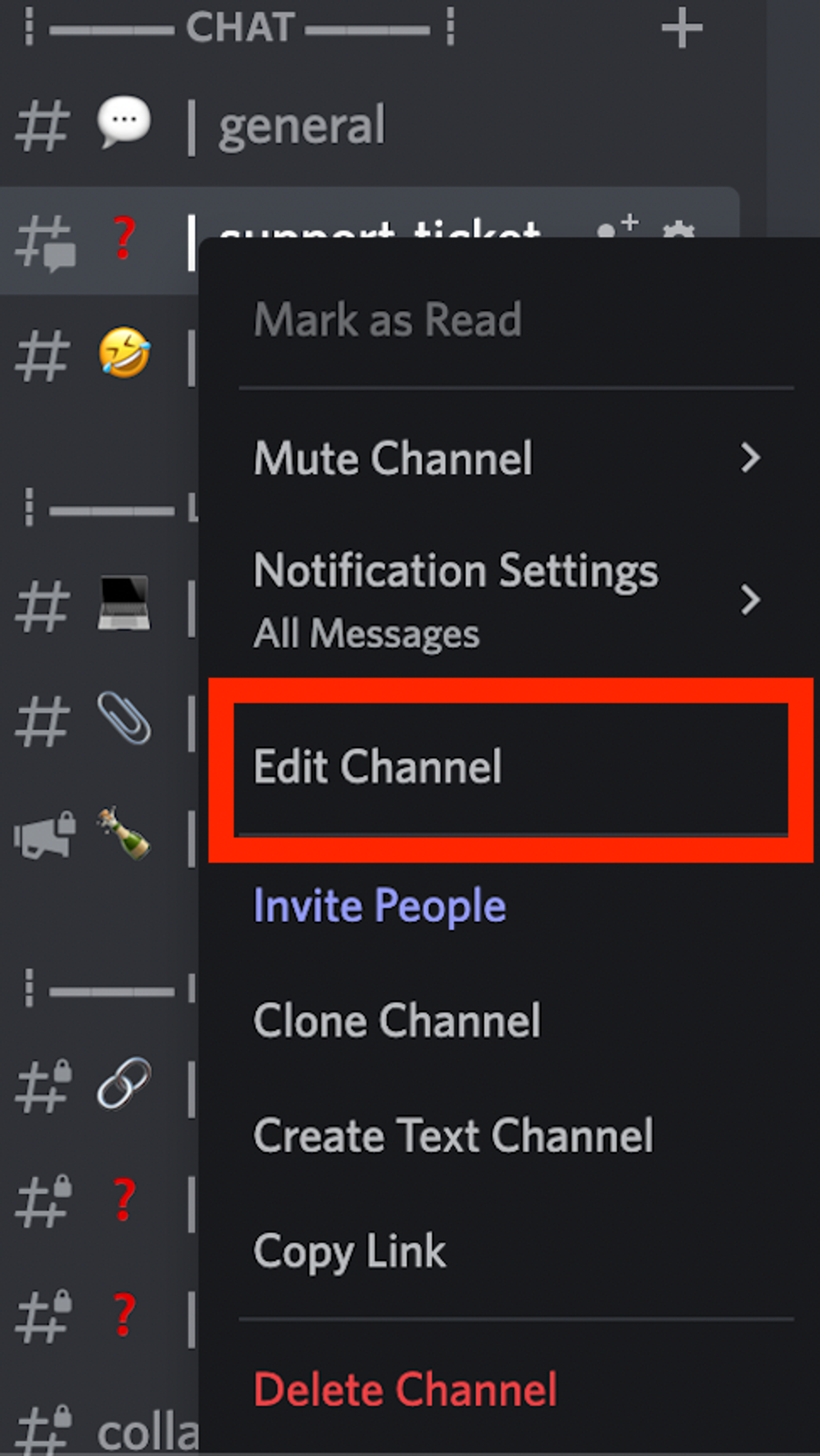 Right click on that channel (’support-ticket’ in our example) and select ‘Edit Channel’