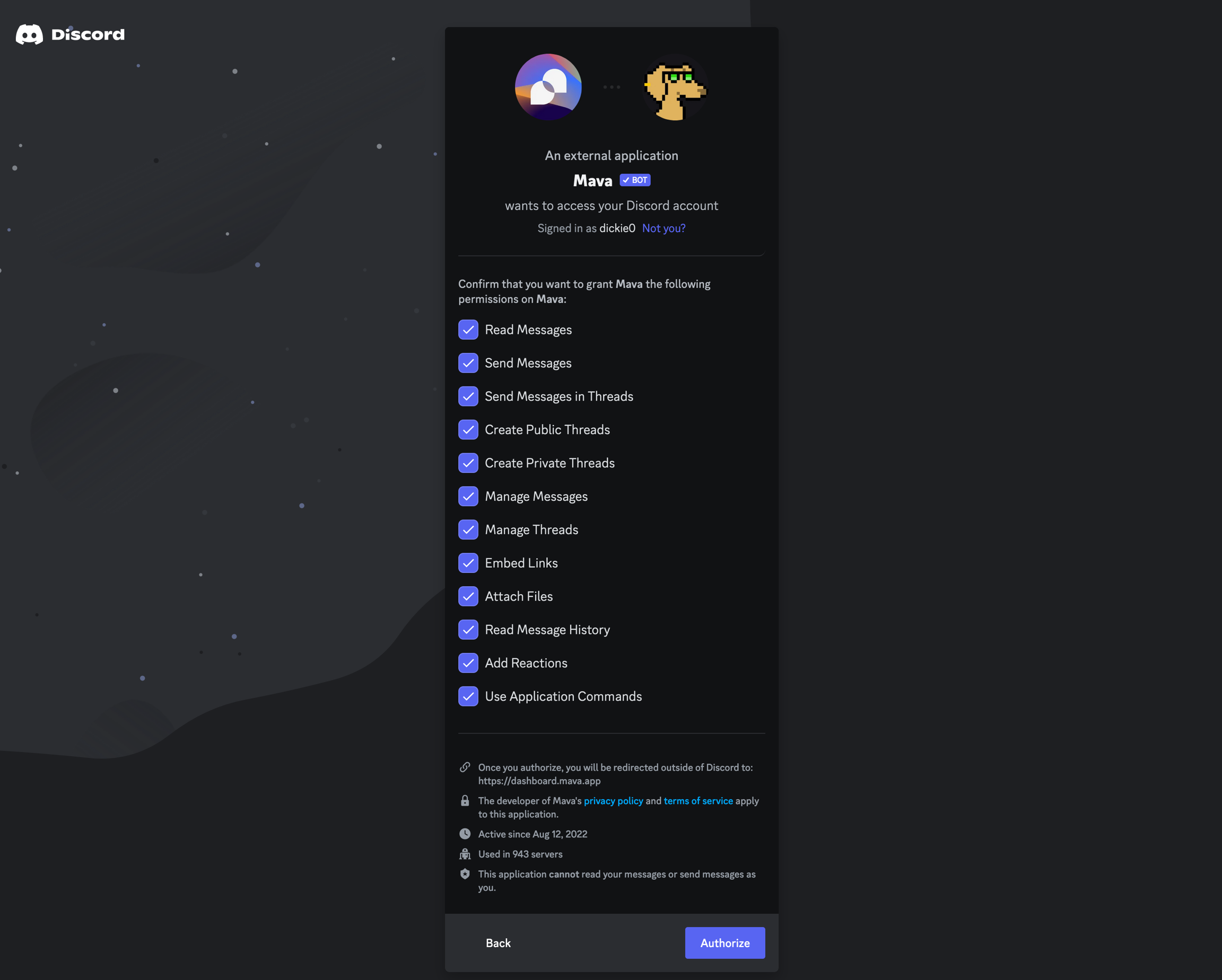 Authorize Mava to join your server (Mava doesn't require admin permissions like most bots, but we do require the permissions listed in the screenshot below to ensure the bot functions properly).