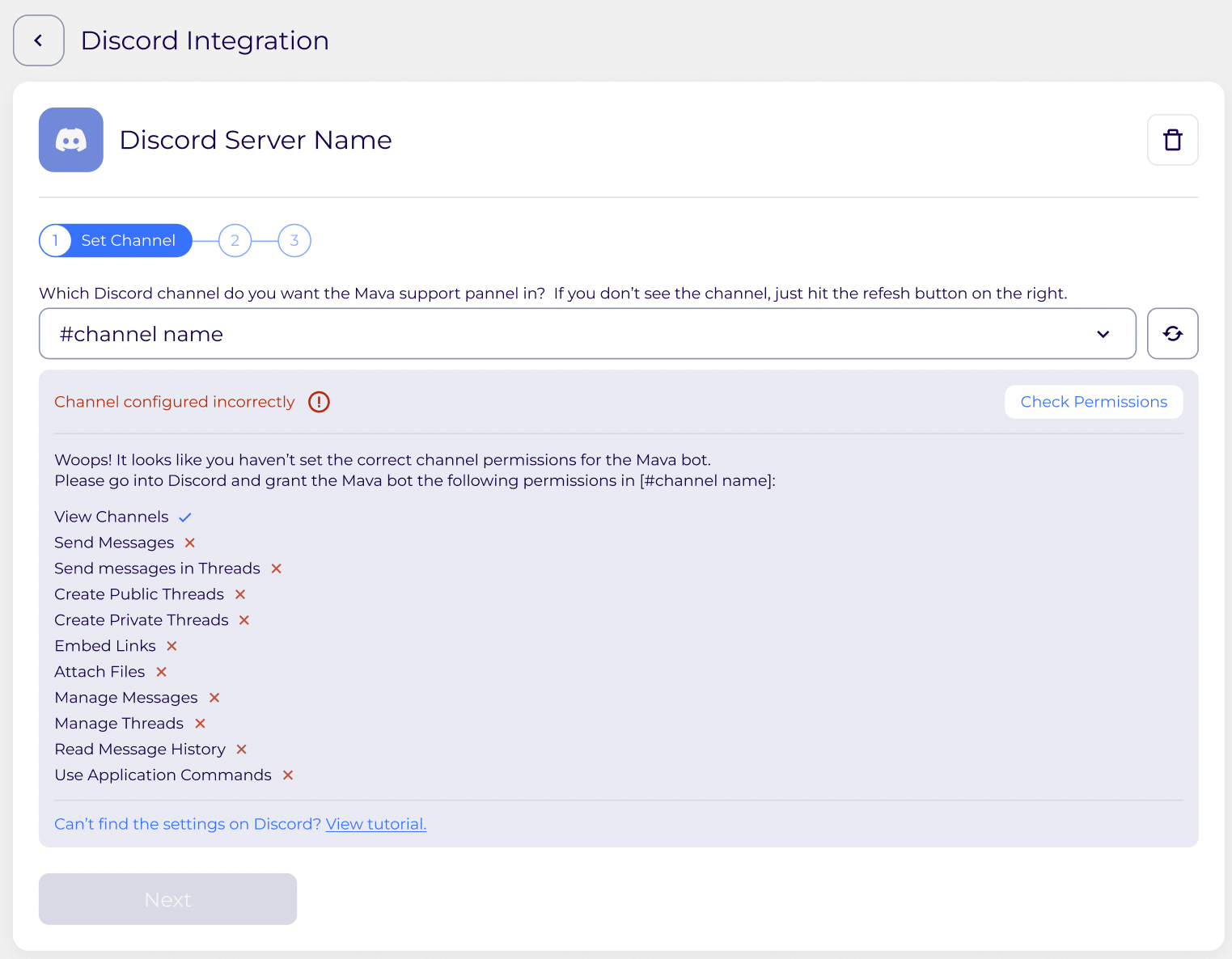After selecting which Discord channel you want the Mava bot in, you might receive an error message like the one below. Move onto the next step to set the correct permissions.