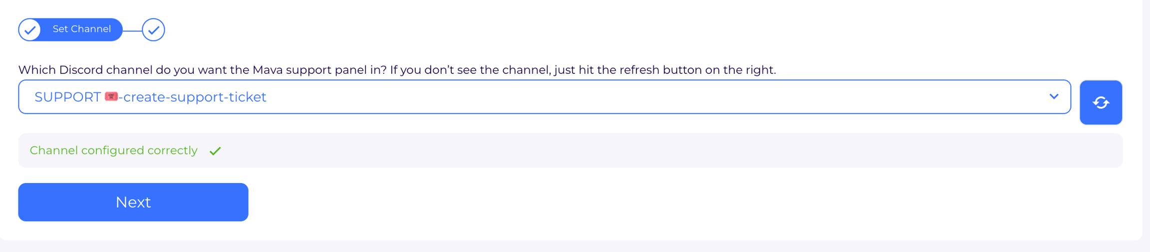 To complete the setup and send the ticket panel to your Discord channel, press the Next button