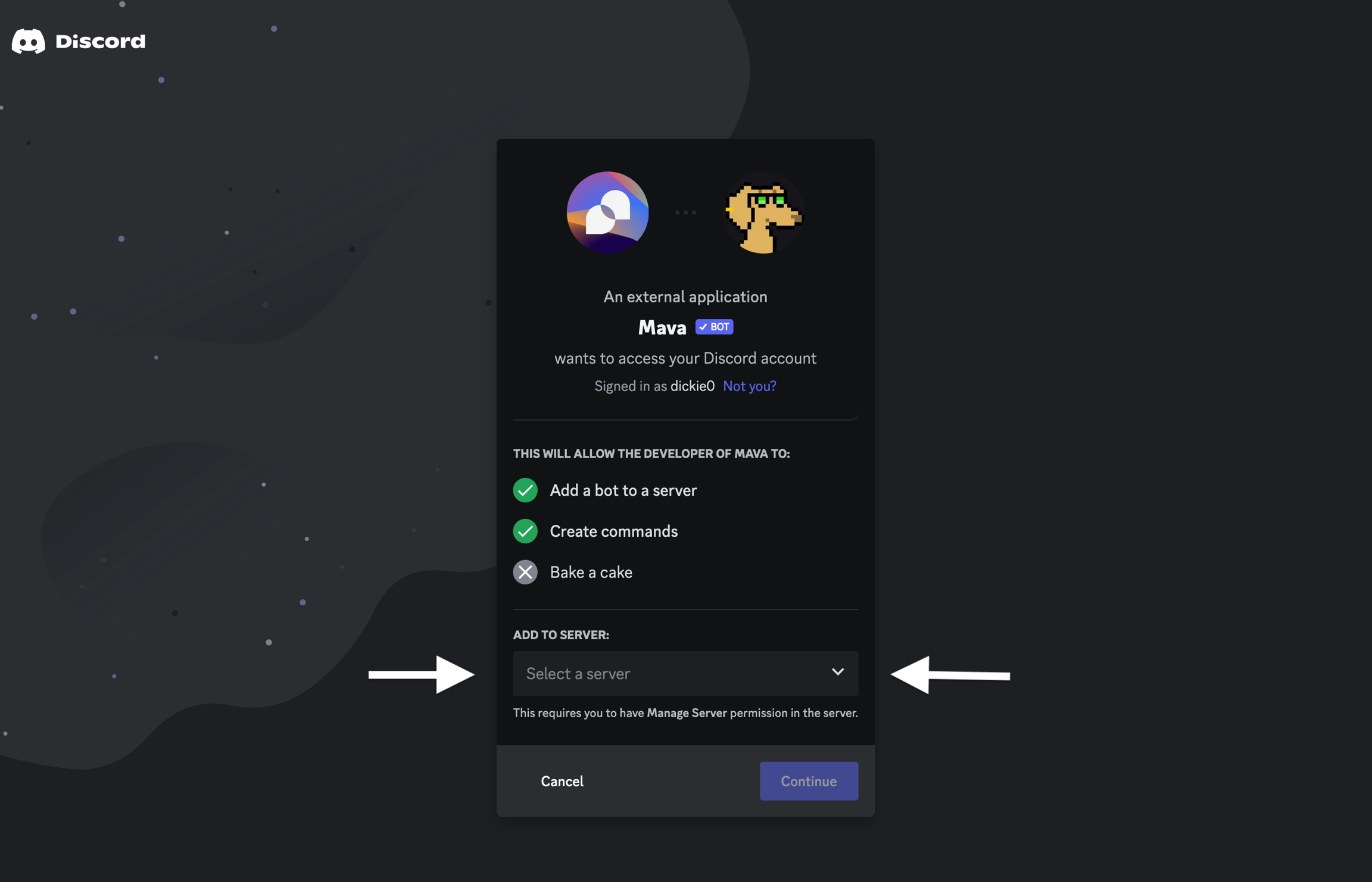 Select which server you want to add Mava to from the dropdown