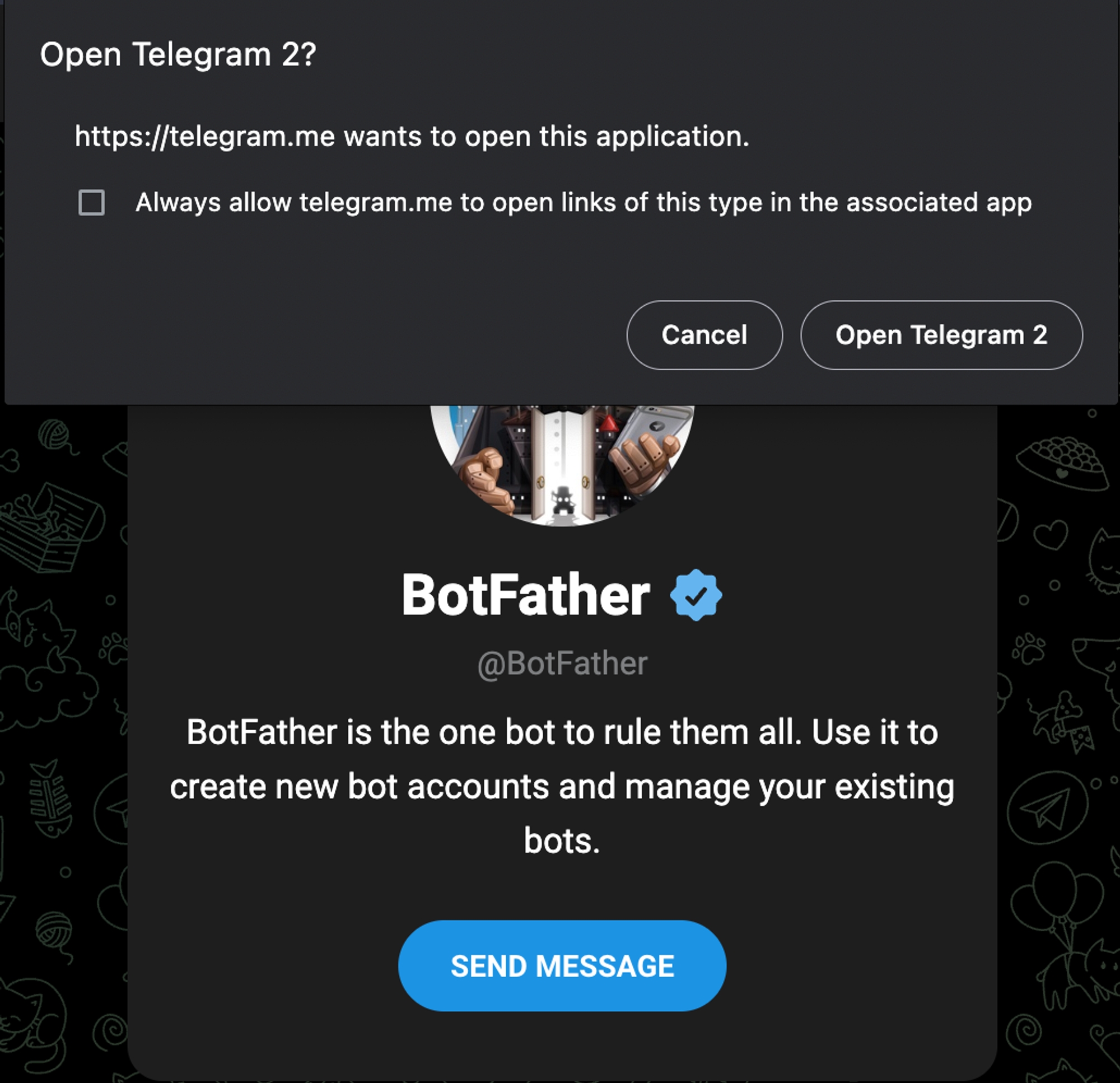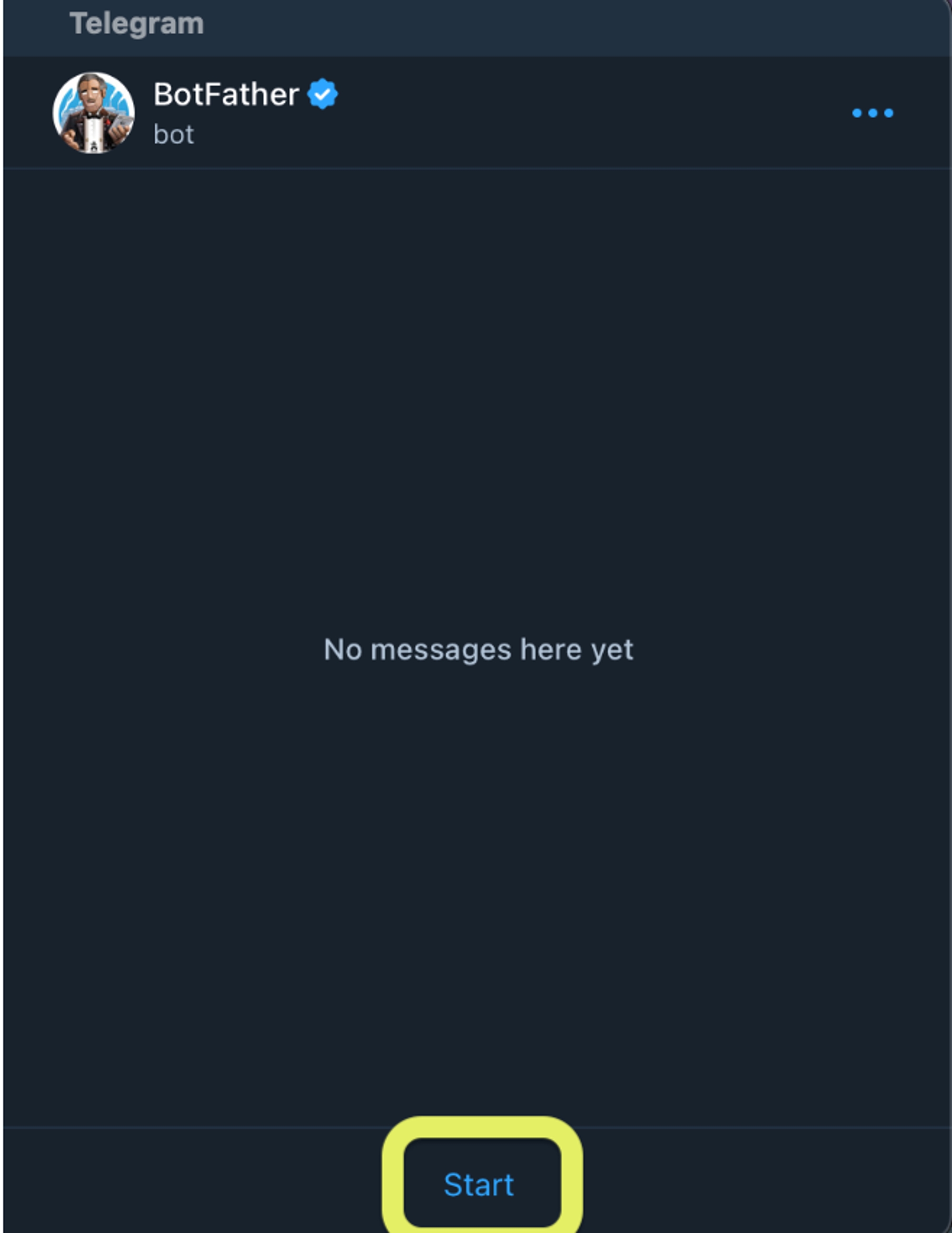 Open ‘BotFather’ via this link: **https://telegram.me/BotFather** and follow the link to Telegram. Once in Telegram press the Start button under the welcome message.
