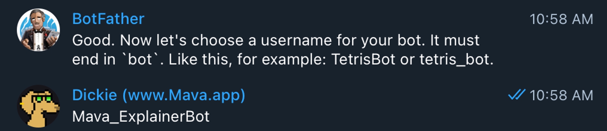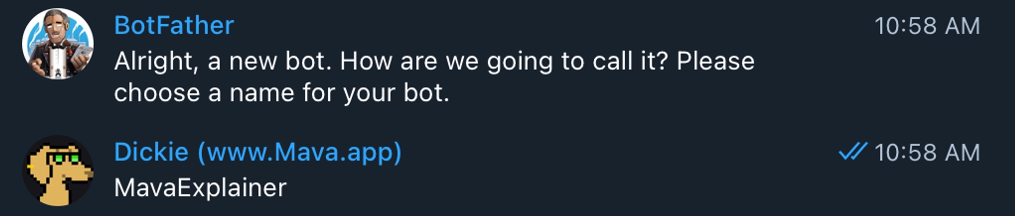 Now you need to name your bot. Think of your name and type it as a message. Pssst. "MavaExplainer" is just an example 🤓, come up with your own.