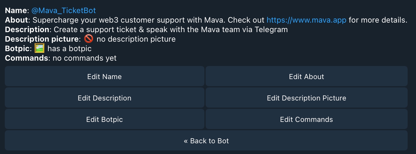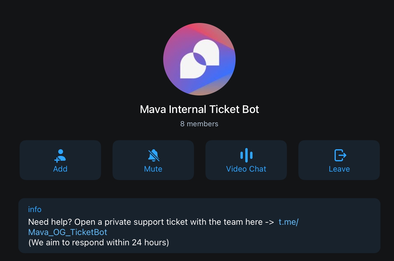 For help with setting up or using the Mava Telegram bot, please either join our Discord and open a support ticket in the ‘Contact-Us’ channel OR create a support ticket via our Telegram bot here