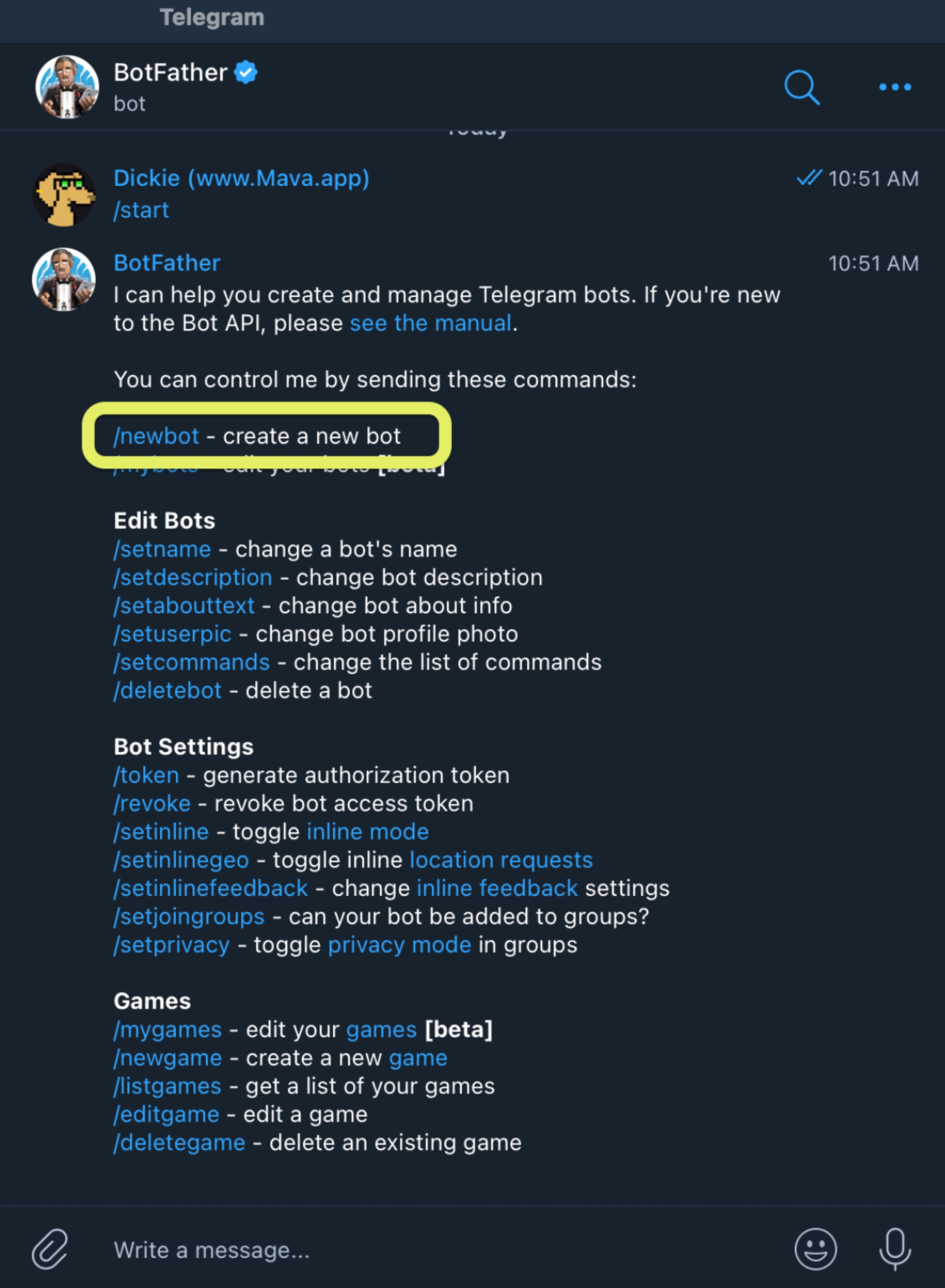 After hitting the Start button, you will see the message below. Click /newbot and choose a name for the bot.