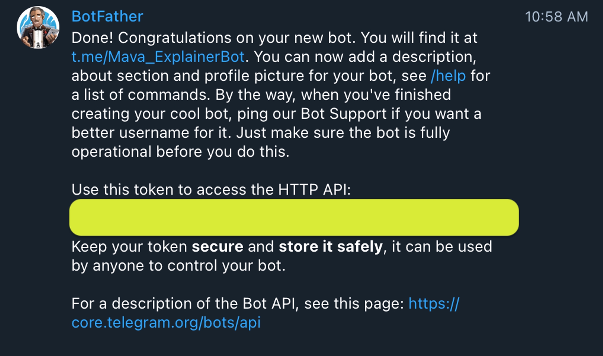 Nice job, your bot has been created 😎. Now you need to copy the HTTP API token (hidden behind the green box below).